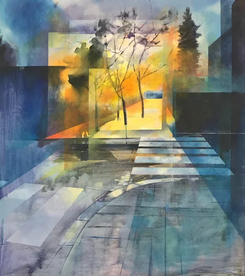Swans have started to appear in my work over the past year, influenced by recent events and a poignant memory of my father helping an injured swan. In Stavanger, the swans can appear in random places. In the painting, I want to convey the peculiarity of these events, construct a multidimensional scene and mix different realities together.